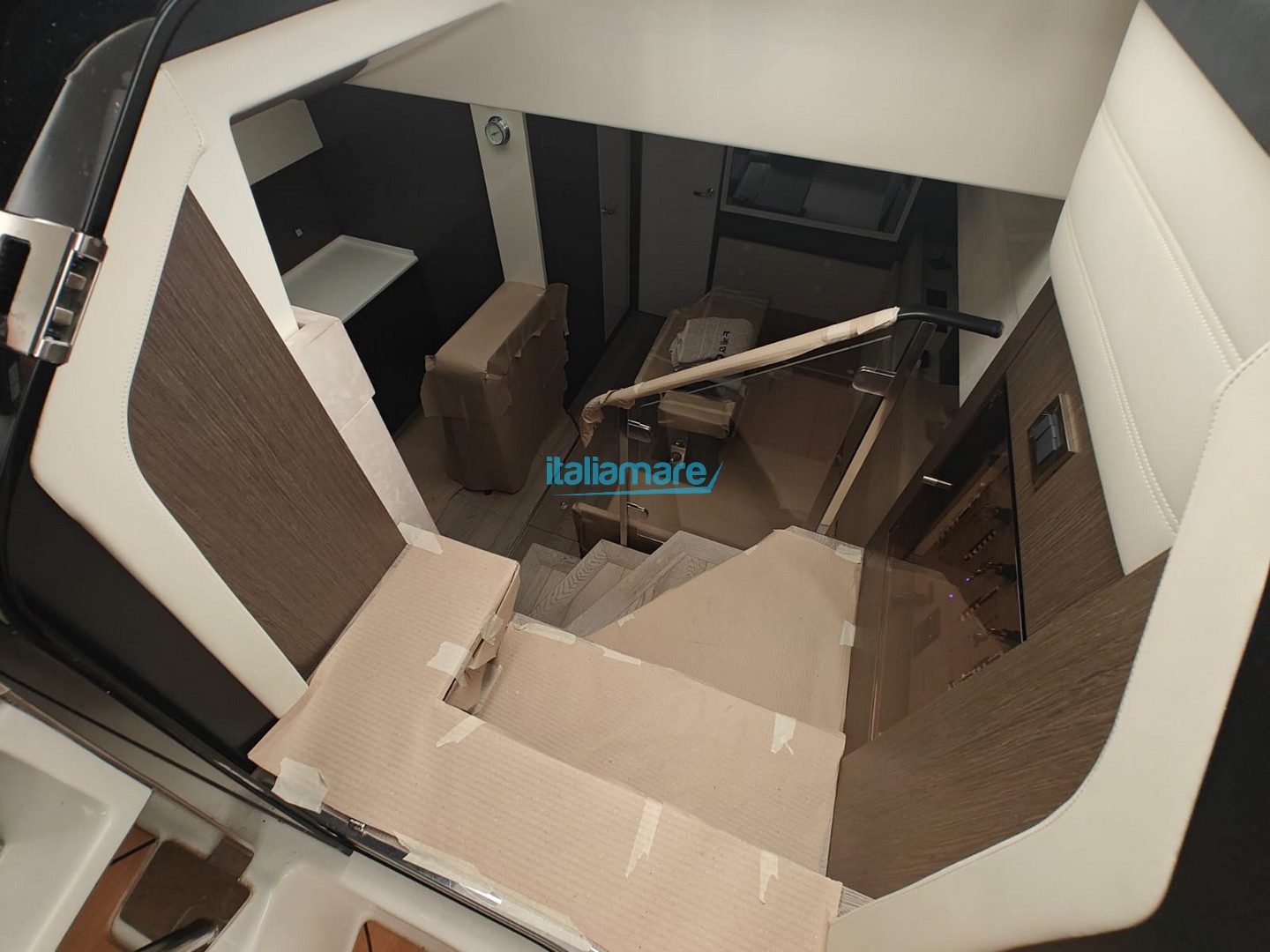 Due grandi aree prendisole molto confortevoli: una a poppa sopra il garage e una spaziosa a prua, facilmente accessibile grazie a passavanti larghi e una robusta battagliola.