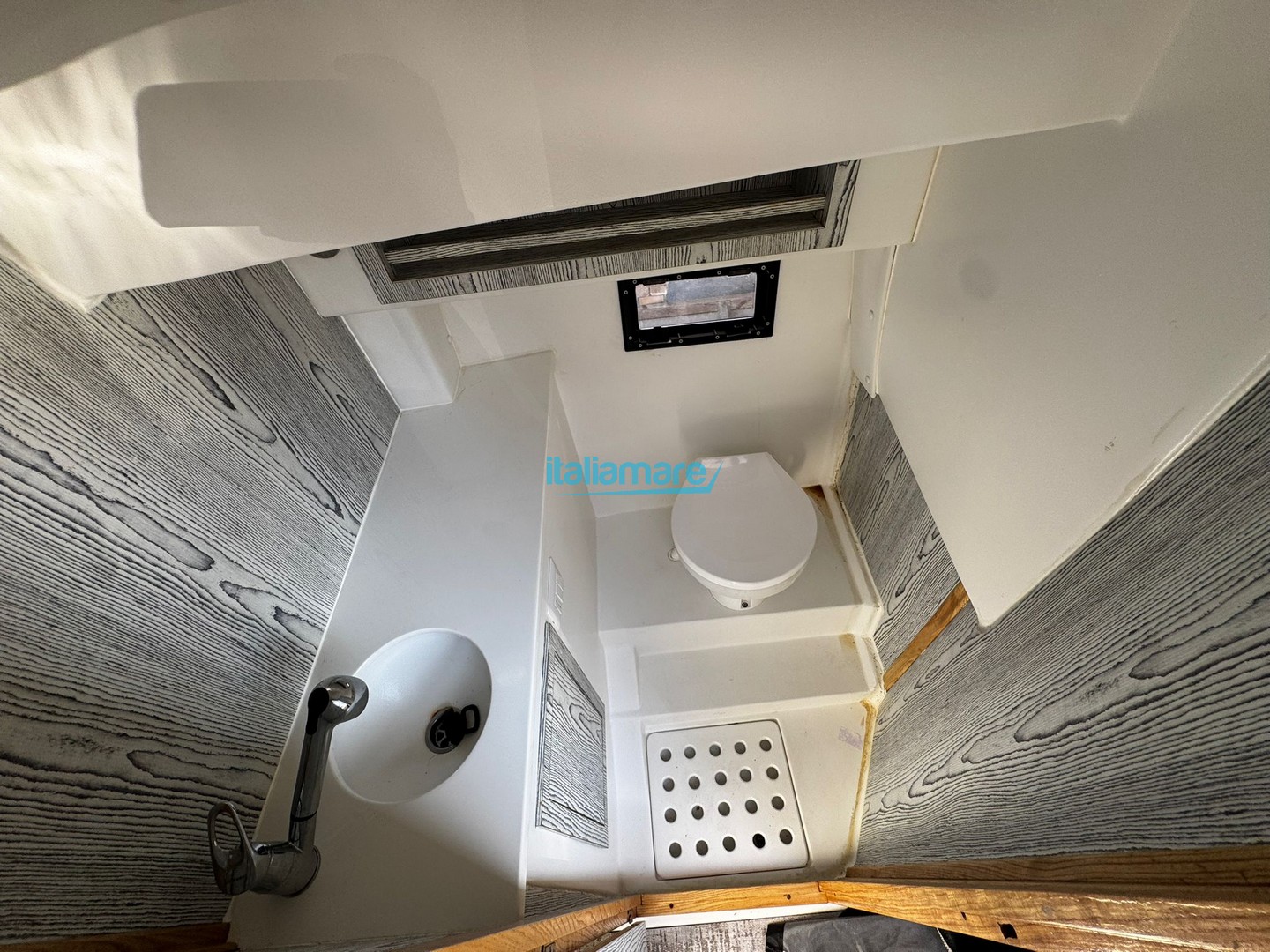 Below deck, the boat surprises with unexpected habitability: it offers four berths split between the convertible forward dinette and a double aft cabin, completed by a separate head that ensures necessary privacy.