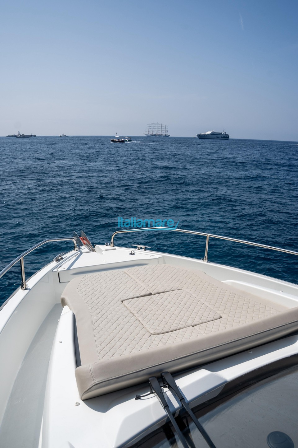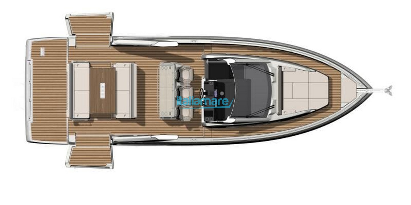 I passeggeri non sono dimenticati a bordo di questa barca sportiva, ma protettiva, con un ampio parabrezza integrato, due comode sedute accanto al pilota, due terrazze modulari fronteggianti, che possono essere rimosse per un'apertura verso il mare… e per coloro che amano la spruzzata del mare, un prendisole nella parte anteriore è accessibile tramite due sicuri e incassati passaggi laterali.
