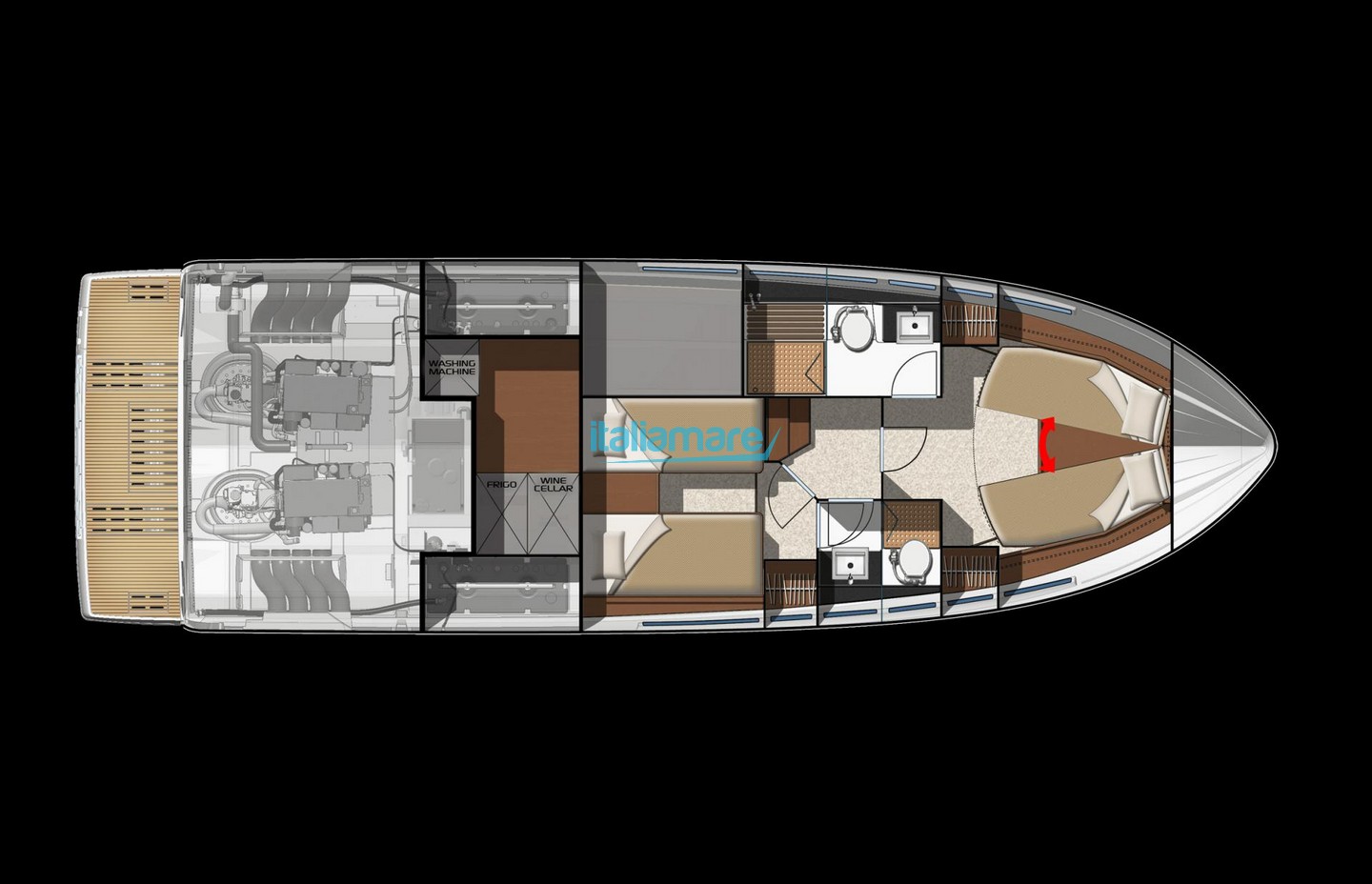 Adotta un design contemporaneo, puntando sulla luminosità e la fluidità degli spazi. Il concetto NC è incentrato sull'apertura: il salone si unisce al pozzetto creando un'unica area conviviale grazie alle ampie porte scorrevoli. Sottocoperta presenta due ampie cabine matrimoniali e un salone convertibile, oltre a due bagni completi.