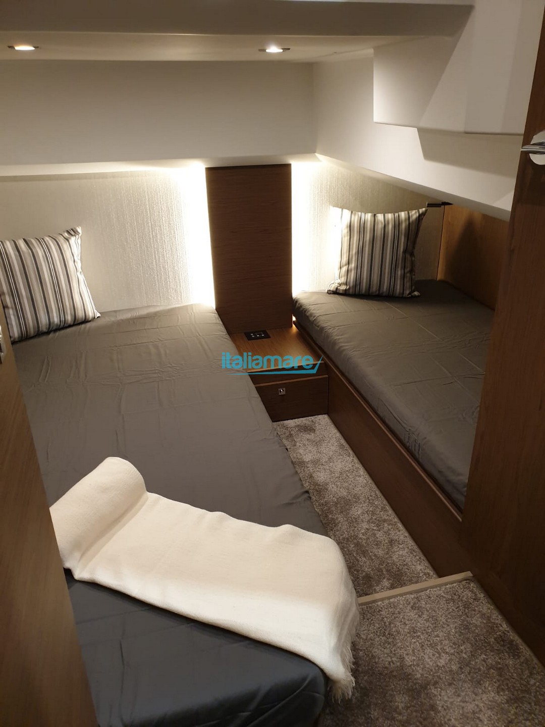 Allestimento tecnico e di coperta: Allarme motore - Allarme sentina - Ancora - Autoclave - Batterie - Camminamenti laterali in teak - Caricabatterie - Colorazione speciale (grigio) - Doccia esterna - Elica di prua - Faro