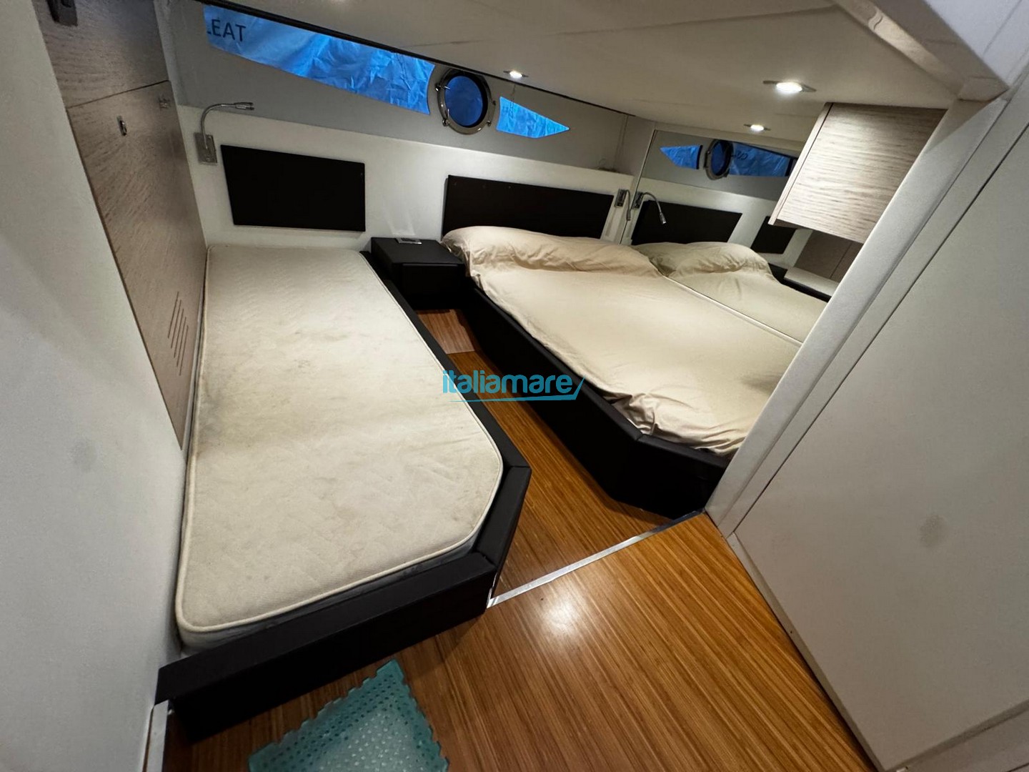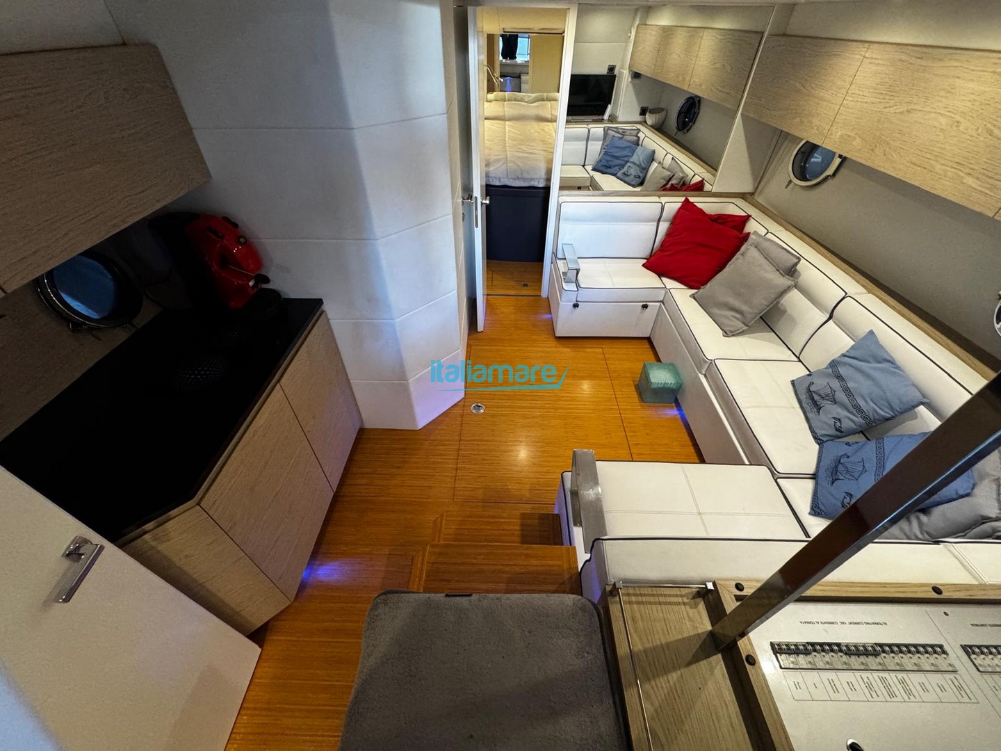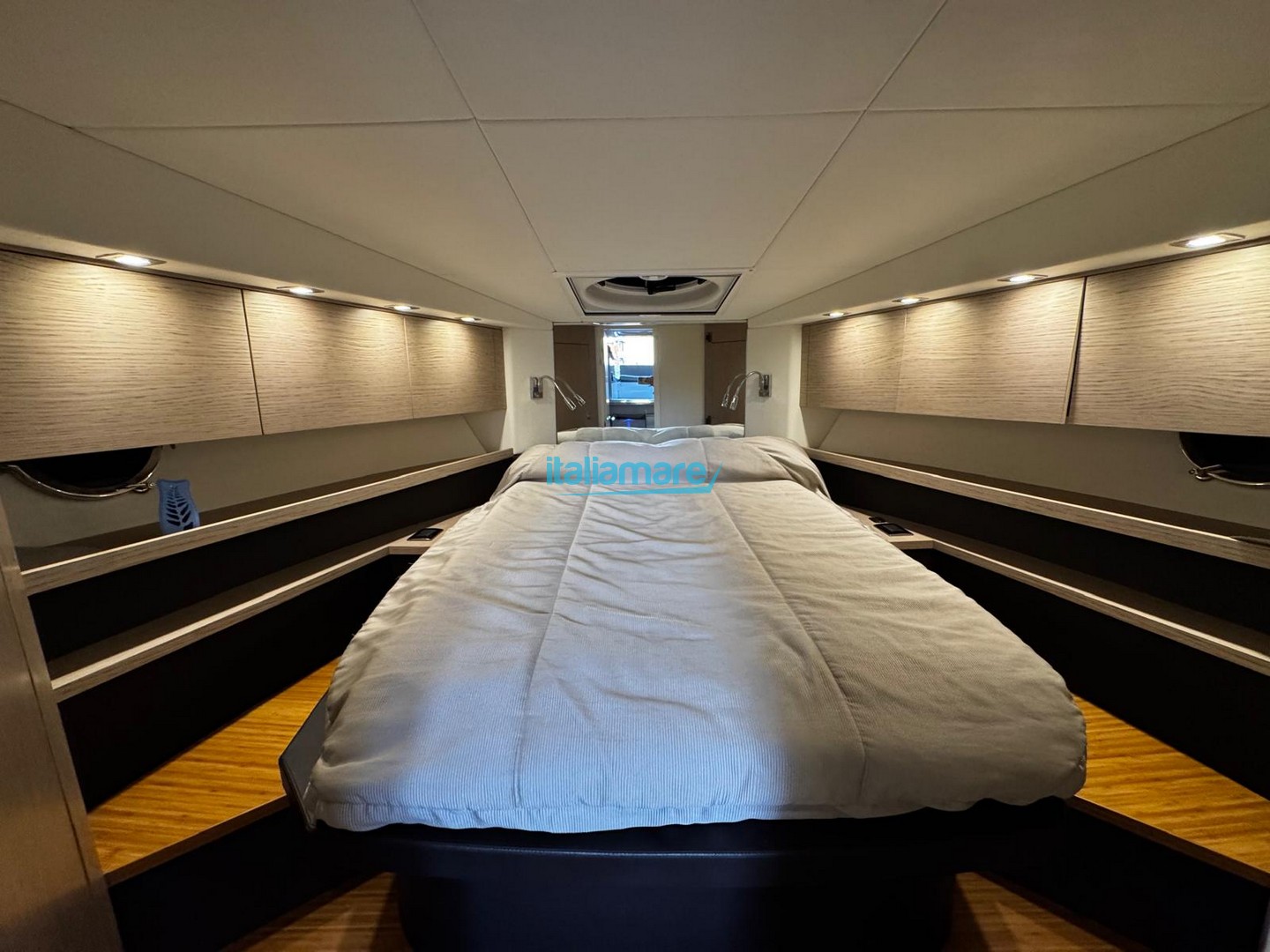 Sottocoperta offre due cabine separate: un'armatoriale di prua spaziosa e una cabina ospiti a poppa con letti in piano trasformabili in matrimoniale.