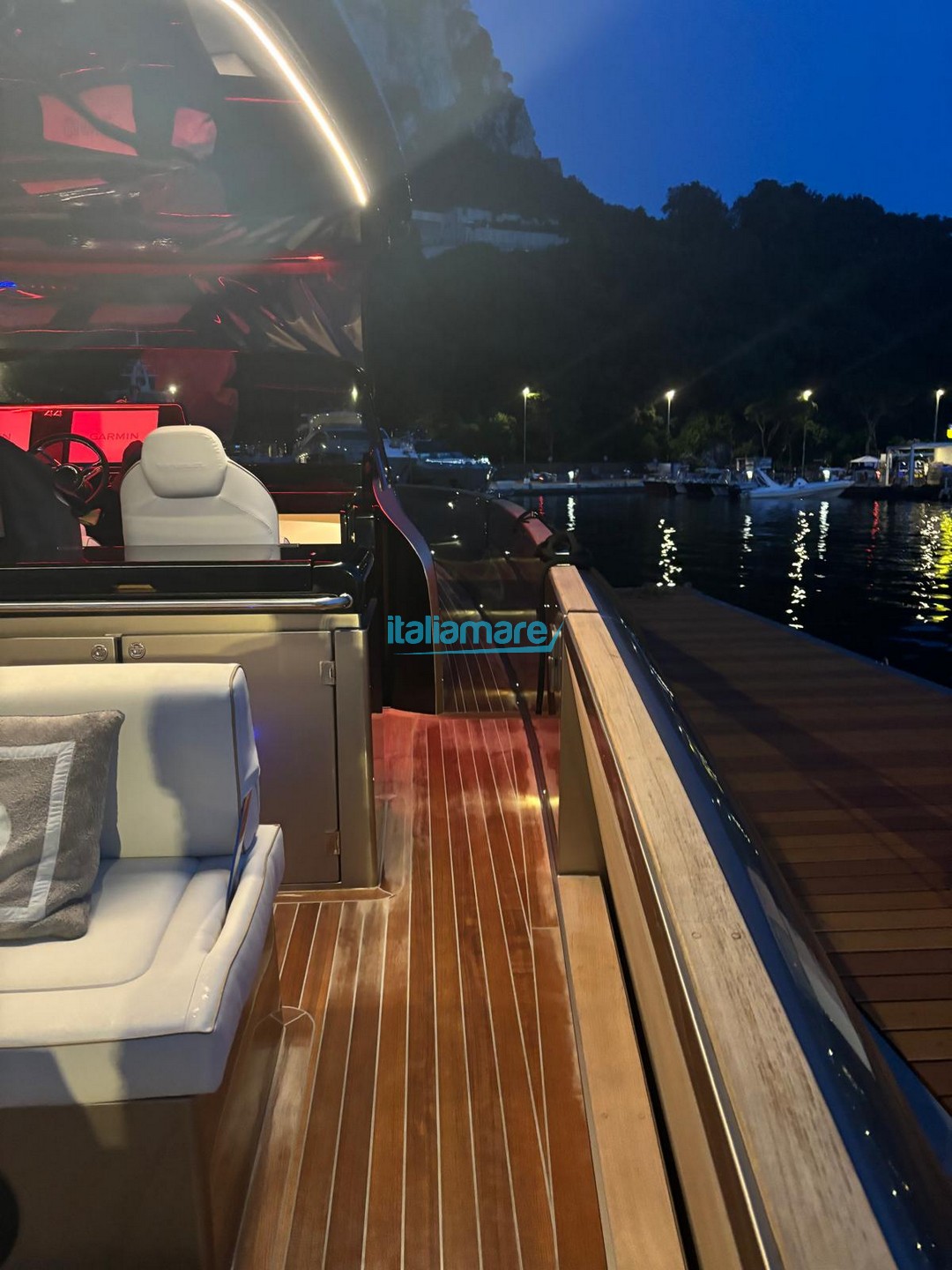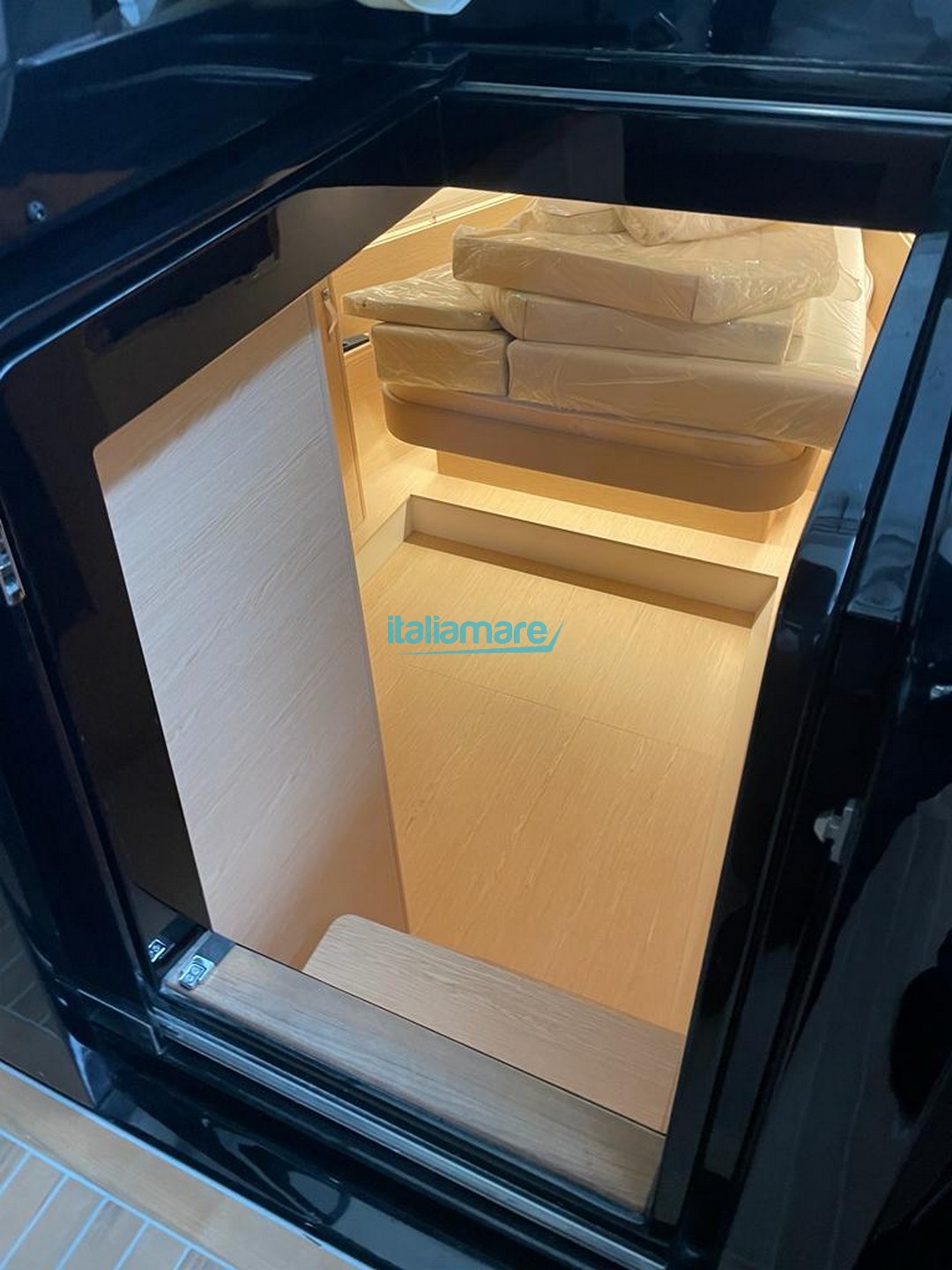 Accessori principali: Aria condizionata - GPS - Strumentazione GARMIN - Teak in pozzetto - Camminamenti laterali in teak - Tavolo pozzetto in teak - Piattaforma idraulica in teak - Pilota automatico - T-top - Stereo
