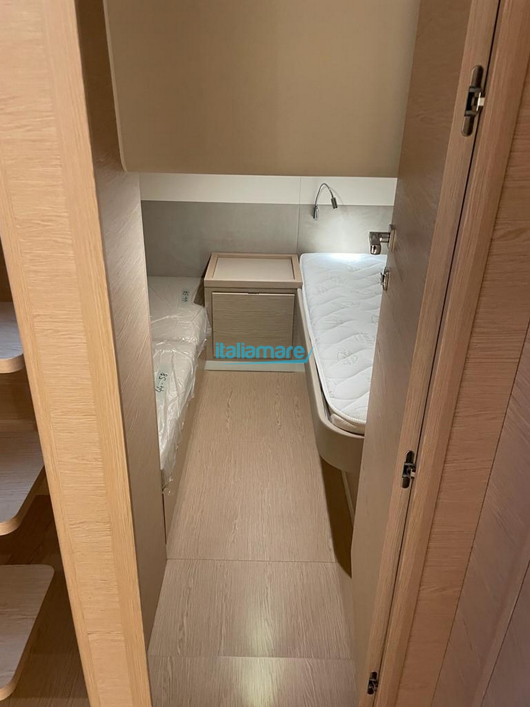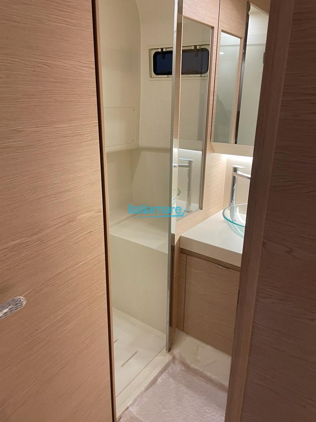 Sottocoperta, la 44 Open offre due cabine matrimoniali, inclusa una cabina armatoriale a prua, e un bagno spazioso con box doccia akseparato.